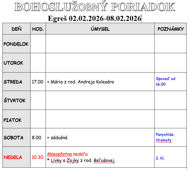 Bohoslužobný poriadok 09.02.2026-15.02.2026