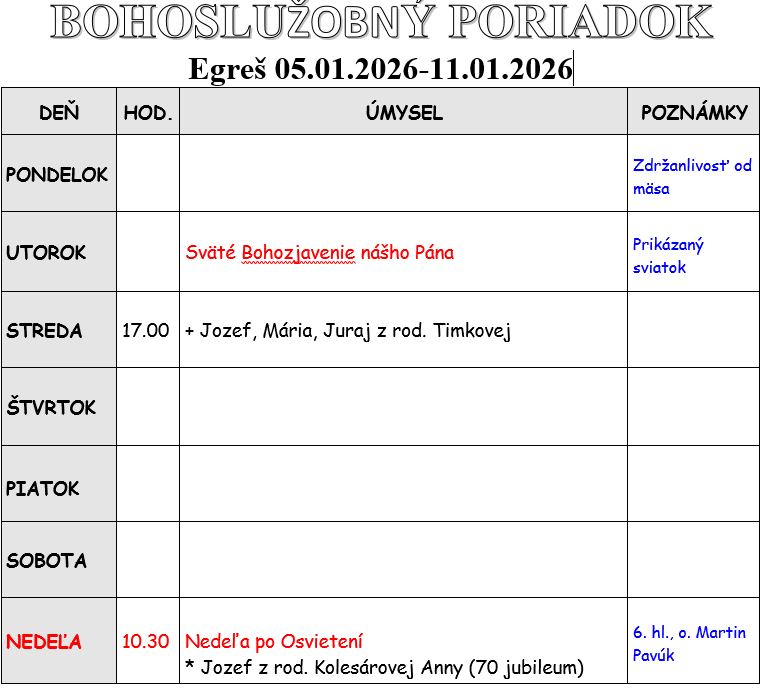 Bohoslužobný poriadok 05.01.2026-11.01.2026
