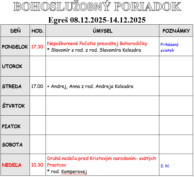 Bohoslužobný poriadok 08.12.2025-14.12.2025