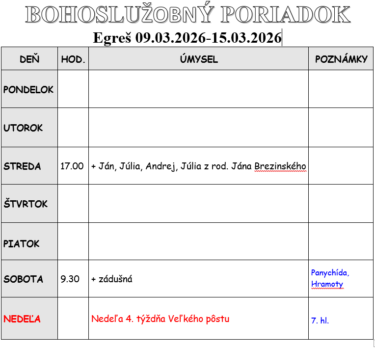 Bohoslužobný poriadok 09.03.2026-15.03.2026