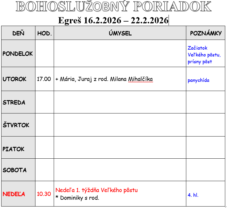 Bohoslužobný poriadok 16.02.2026-22.02.2026