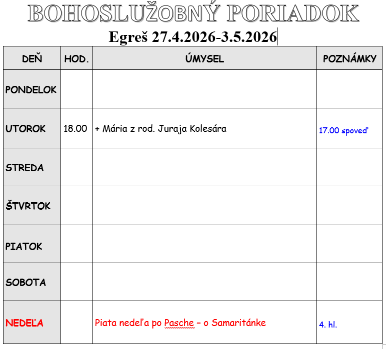 Program bohoslužieb týždeň od 27.04.2026 do 03.05.2026
