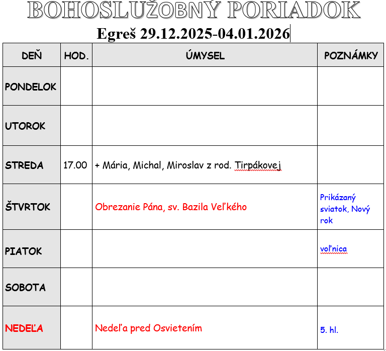 Bohoslužobný poriadok 29.12.2025-04.01.2026