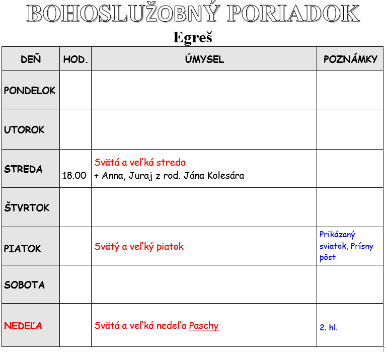 Program bohoslužieb týždeň od 30.03.2026 do 05.04.2026
