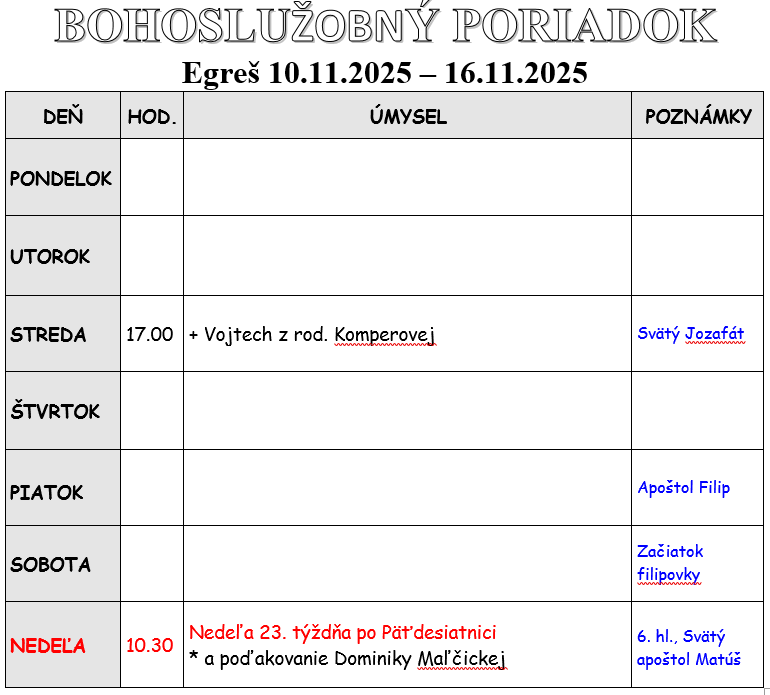Bohoslužobný poriadok 10.11.2025-16.11.2025