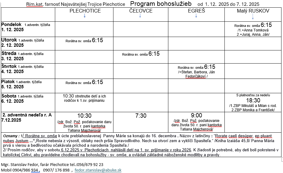 Program bohoslužieb týždeň od 01.12.2025 do 07.12.2025