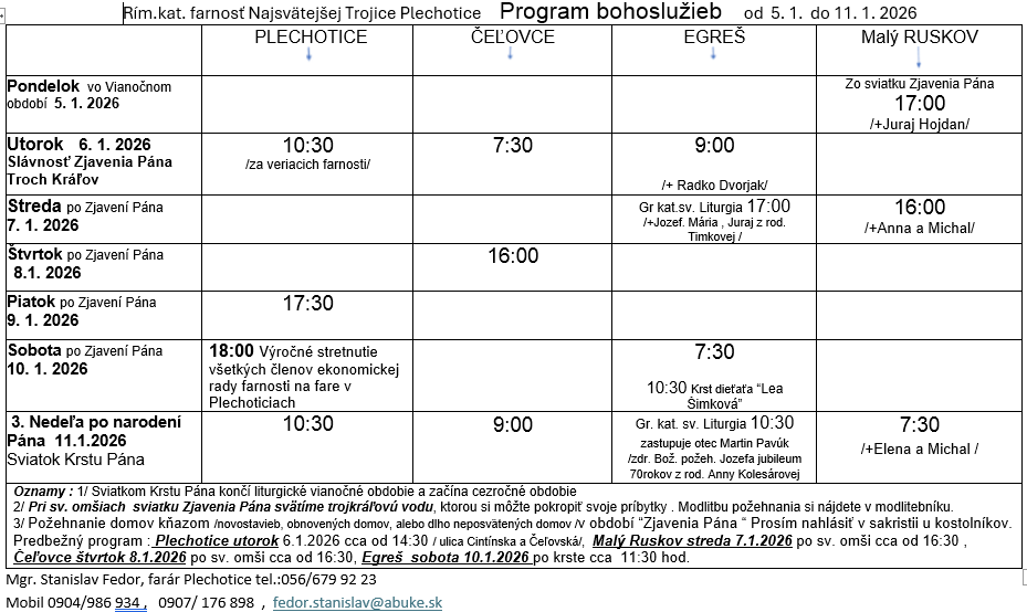 Program bohoslužieb týždeň od 05.01.2026 do 11.01.2026