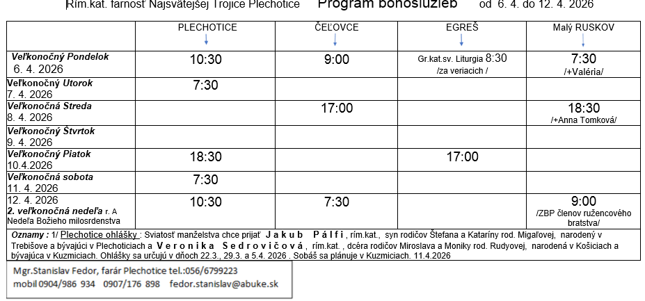 Program bohoslužieb týždeň od 30.03.2026 do 05.04.2026