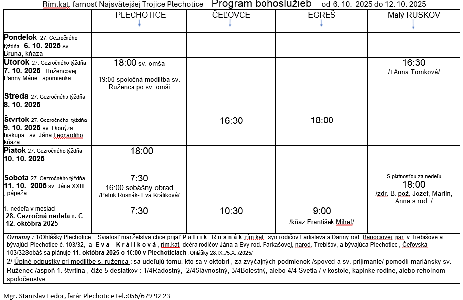 Program bohoslužieb týždeň od 06.10.2025 do 12.10.2025