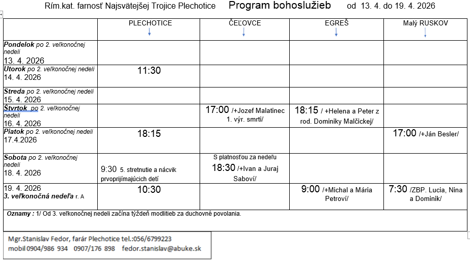 Program bohoslužieb týždeň od 13.04.2026 do 19.04.2026
