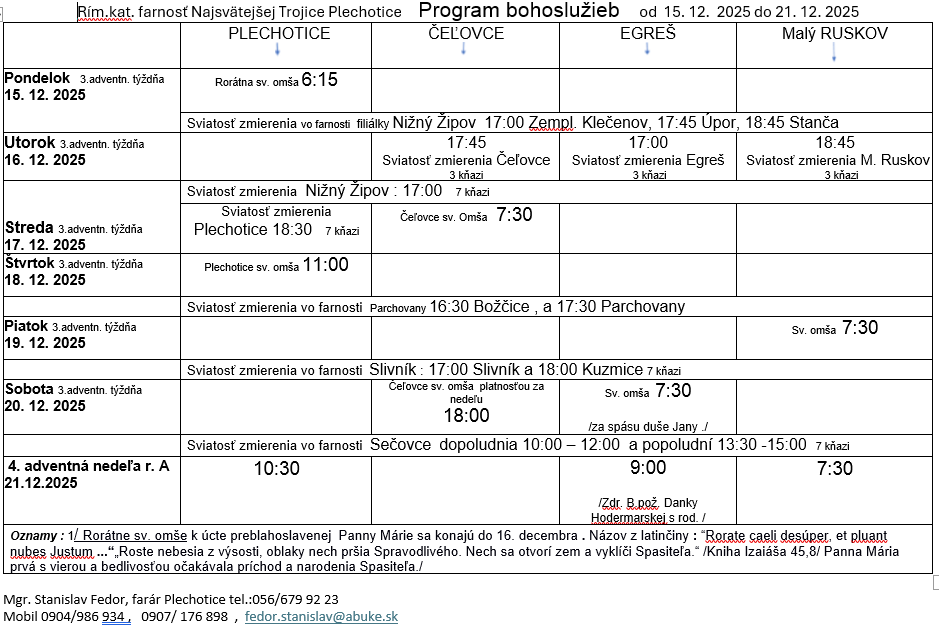 Program bohoslužieb týždeň od 15.12.2025 do 21.12.2025