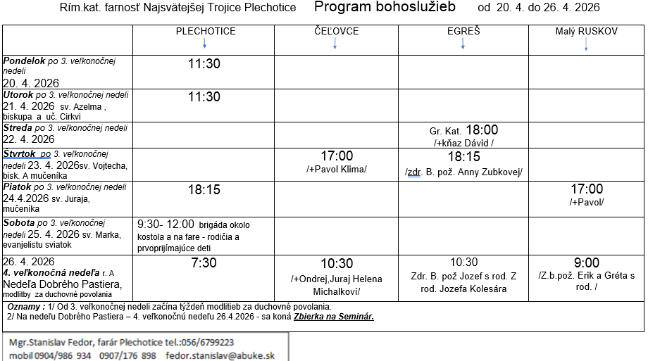 Program bohoslužieb týždeň od 20.04.2026 do 26.04.2026