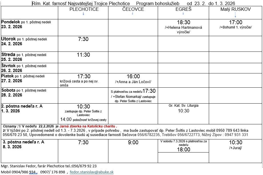Program bohoslužieb týždeň od 23.02.2026 do 01.03.2026