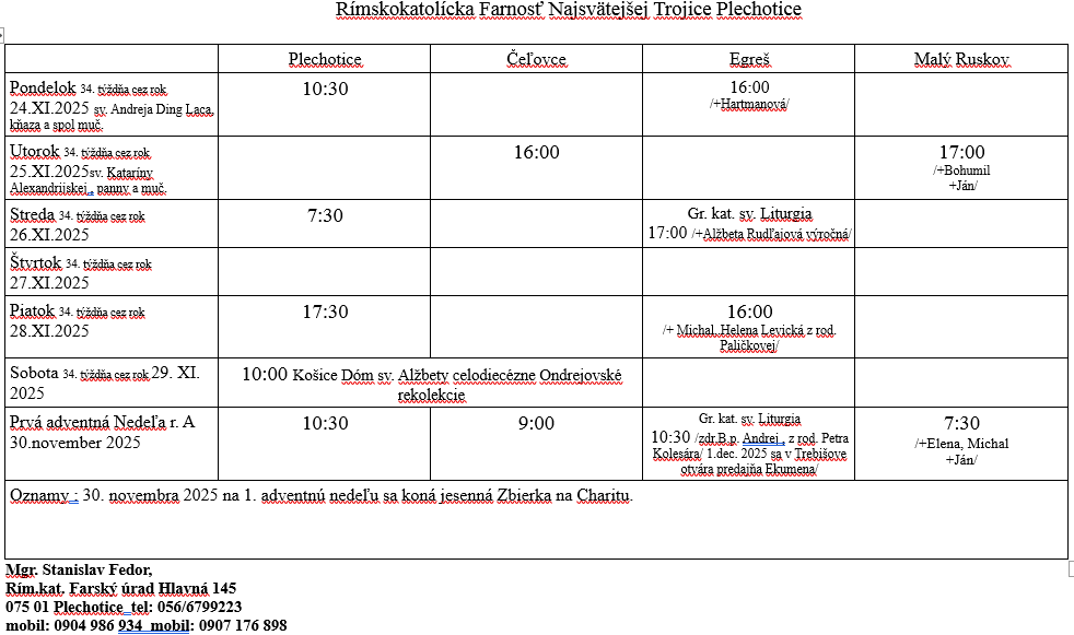 Program bohoslužieb týždeň od 24.11.2025 do 30.11.2025