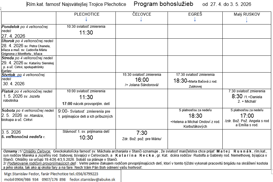 Program bohoslužieb týždeň od 27.04.2026 do 03.05.2026